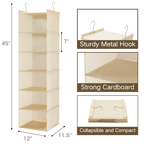 MAX Houser 6 Tier Shelf Hanging Closet Organizer, Cloth Hanging Shelf with 2 Sturdy Hooks for Storage, Foldable (Beige)