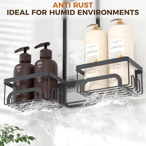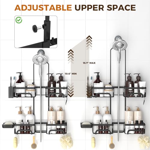 【RUSTPROOF & DURABLE】Constructed with stainless steel and rustproof coatings, the shower caddy over shower head resists corrosion in humid environments. All baskets with quick-drain holes prevent water accumulation, and the reinforced frame of the shower caddy supports up to 40 lbs weight.