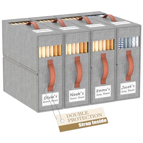4 Pack Bed Sheet Organizers and Storage(King &Queen Size) with an Elastic Strap, Foldable Closet Linen Sheet Storage Container, Sheet Set Box for Blankets, Duvet Covers and Pillowcase, Grey