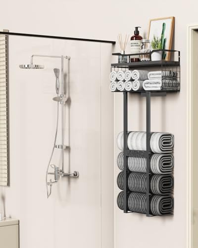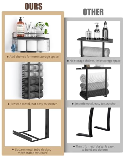 Sturdy & Vertical Storage Master: This towel holder with sturdy metal frame paired with a floating wood plank shelf; Clean look blends in any room while maximizing vertical storage space; Reliable design securely stores towels, toiletries, and decor essentials without clutter