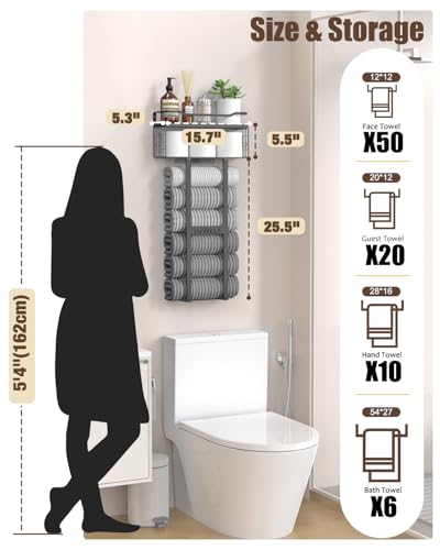 Large Size Bathroom Organizer: Size: L15.7“ x W 5.3” x H 31″, 5.3 inches from the wall, Bathroom Towel Rack can hold 6-50 towels, Upgraded Top Basket Design for 3-5 Rolls of Toilet Rolls and All Toiletries, Easy Storage for All Bathroom Supplies,Ideal for use in apartments, dorm rooms, RV and campers