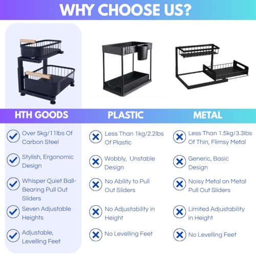 Premium Heavy Duty Carbon Steel Under Sink Organizer, 2 Tier Pull Out Cabinet Organizer, 7 Adjustable Heights with Smooth Ball Bearing Sliding Baskets for Bathroom & Kitchen