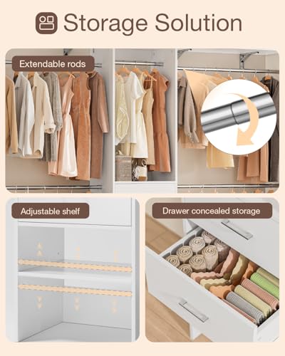 Versatile Rods: 5 robust stainless steel garment rods extends from 22.4″ to 40″ in length, accommodating various clothing types. TThe walk in closet organizers and storage ‘s width adjusts from 5-9Ft to fit your wardrobe closet with drawers perfectly