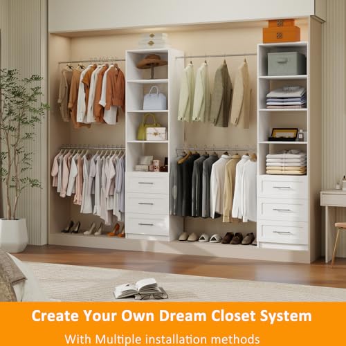 Aheaplus Closet System with 8 Wooden Drawers, Wood Closet Organizer System with Tower, Walk-in Closet Organizer Wardrobe Clothes Rack with 4 Hanging Rods, Garment Rack, Cut to Fit 7-12Ft, White