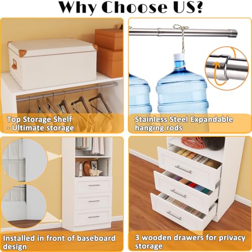 Closet System with Drawers, 8FT Wood Closet Organizer System Walk-in Closet Standalone Corner Closets Storage with Hanging Rods Freestanding, White (8FT)