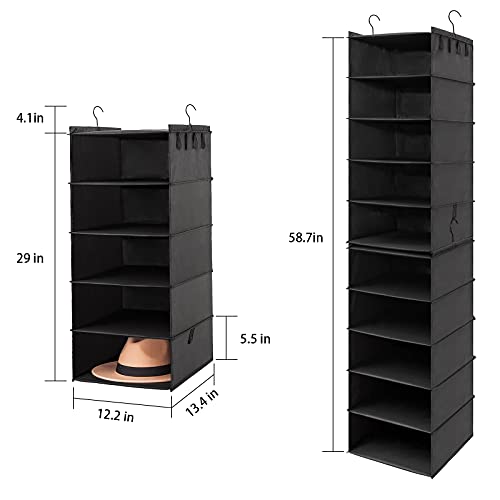 【LARGE SPACE】10 Shelves space-saving fabric hanging organizer, with 8 loops and metal hooks, size 58.7”(L)X12.2’‘(W)X13.4”(D). Provides roomy, open access for daily items ideal for homes, dorms, and storage areas. Durable construction and sturdy frame keep items organized and decluttered.
