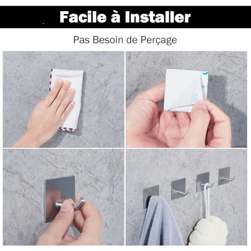 Heavy Duty Adhesive Hooks, Stick on Wall Adhesive Hangers, Strong Stainless Steel Holder, Self Adhesive Hooks for Kitchen Bathroom Home Door Towel Coat Key Robe 4 Packs Silver
