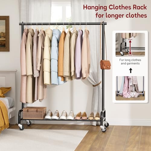【Higher Dress Rack】The height of the closet rack is 63″ from the top to the rack base (not to the wheels), rolling coat rack has enough space to accommodates short and long garment, shirts, pants sweaters, jackets, even long skirts, dress, trench, etc; You can install clothes racks for hanging clothes in half an hour to use parts and detailed instructions in the package, so you can quickly have more space to tidy up your clothes.