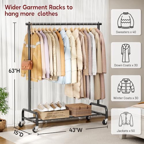 【43”Wide-Storage Aplenty】 This 43″W x 15″ D x 63″H metal clothes rack serves as an extension of your closet, it’s wider than general clothing rack, this rolling rack with wheels adding tons of hanging space to keep up to 50 shirts or 30 winter coats in order, so that the daily organization is more orderly.