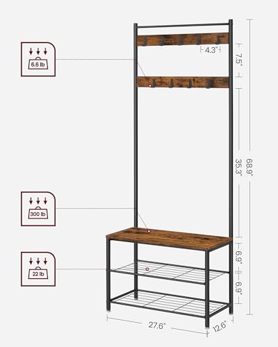 VASAGLE Coat Rack, Hall Tree with Shoe Storage Bench, Entryway Bench with Shoe Storage, 3-in-1, Steel Frame, for Entryway, 12.6 x 27.6 x 68.9 Inches, Industrial, Rustic Brown and Black UHSR41BX