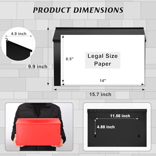 LARGE CAPACITY: Boasting a generous size of 15.7W”*4.9D”*9.9H”, this mailbox easily handles large envelopes, magazines, small parcels, and bulk mail—ideal for high-capacity needs. Measure your space first for a snug fit.