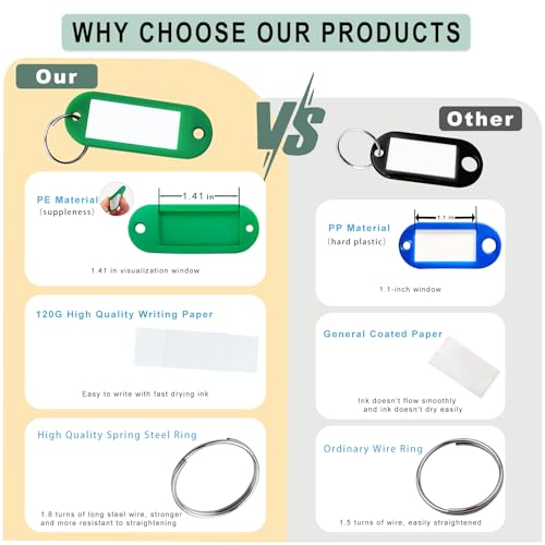 The 20 PE key tags are made from aflexible and durable material. Their larger windows provide ample space forwriting and displaying detailed information, such as the rooms or areas eachkey corresponds to. With 10 distinct colors, whether it’s the key to a warehousedoor, an office drawer, or your home, you can quickly spot the right keythrough these vibrant tags, saving you precious time.