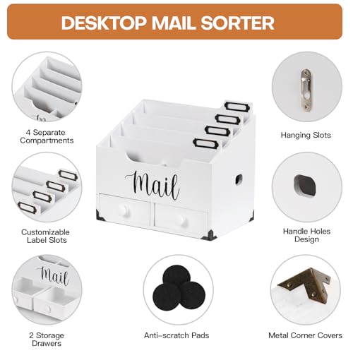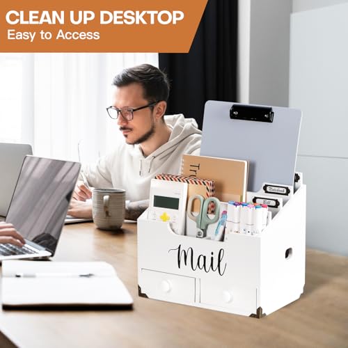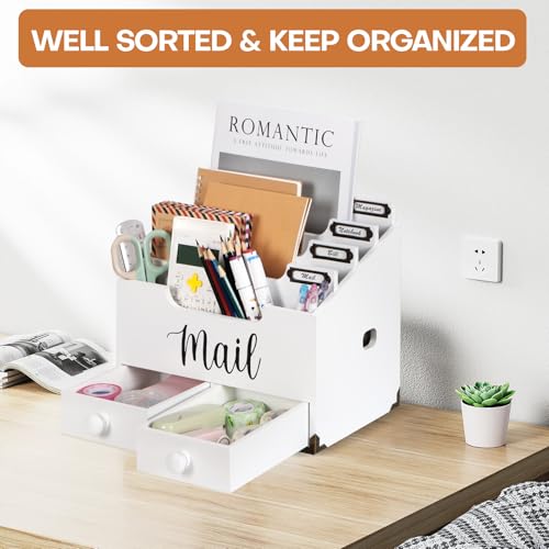 RELBRO Mail Organizer Desktop, Wood Desk Organizer with 2 Drawers, 4 Compartments for Home Office Accessories, White