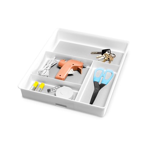 Madesmart Classic 4-Compartment Drawer Organizer Gadget Tray, Plastic Multipurpose Storage Bin for Drawers, White