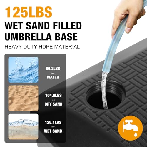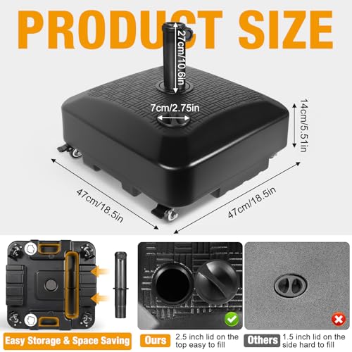 WIDE MOUTH FILLING: Upgraded water fill hole(Diameter 2.5in; others are 1.5in), opening at the top for easy access to add water or sand, the umbrella stand can hold up to 80.2 lbs of water, 104.6 lbs of sand, or 125.1 lbs of wet sand, ensuring the umbrella stays upright in strong winds.