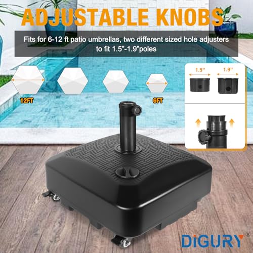 FITS UMBRELLAS 6-12FT: Our elegant umbrella base fit most market umbrellas from 6ft to 12 ft, the package includes two PVC sleeves to accommodate different pole sizes. Simply select the sleeve that matches the diameter of your umbrella pole and use the adjustable knob to ensure a secure fit.