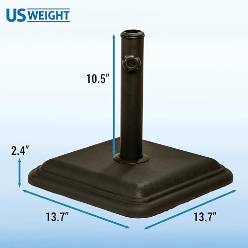 Secure your patio umbrella with ease using the US Weight 26 lb. umbrella base. The 13.7” L x 13.7” W x 2.4” H diameter base features a 10.5” stem with adjustable collars. These collars accommodate a variety of umbrella pole sizes ranging from 1.3” to 1.8”. Additionally, the stem includes a support knob to tighten and secure the post in place. This base also includes 4 PVC feet on the bottom of the base. This 26 lb. umbrella base is intended only to be used with patio tables.