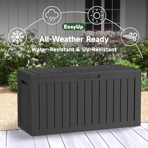 WATERPROOF AND FADE-RESISTANT – Made from durable, eco-friendly resin, this deck box is both waterproof and UV-resistant, ensuring long-lasting use. With UV resistance tested for over 1,000 hours, it protects your belongings from sun and rain throughout every season.