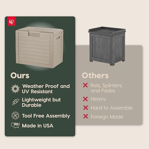 WEATHER PROOF STORAGE: Our durable resin with Anti-Ultraviolet Agent makes it ideal storage solution for cushions, garden tools, and toys, guaranteeing that your items maintain their good condition, protected from sun and water damage.