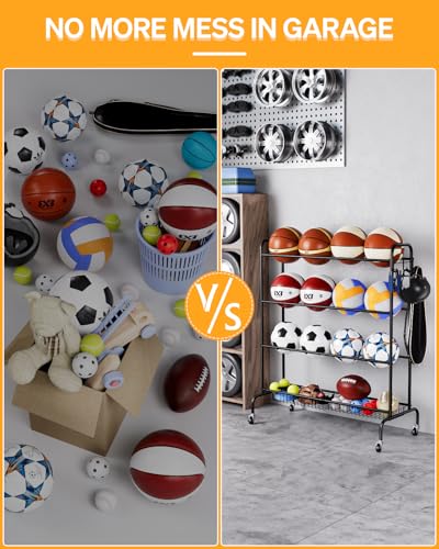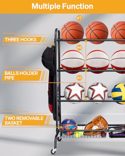 Basketball Rack, Rolling Basketball Shooting Training Stand,Sports Equipment Storage with Wheels, Four-Layer Organizer Holder with Two Basket for Basketballs Footballs Volleyball