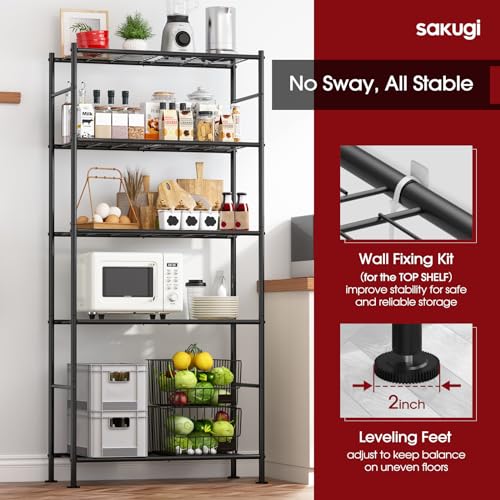 ULTRA-STABLE FOR SAFE STORAGE: Safety and stability are top priorities. Each storage shelf is equipped with 4 non-slip adjustable leveling feet to ensure it maintains balance on uneven floors. Additionally, the included wall fixing kits provide an extra layer of security, preventing tipping, shifting, or wobbling when storing heavy items. Sakugi kitchen shelves keep your valuables well-organized within reach.