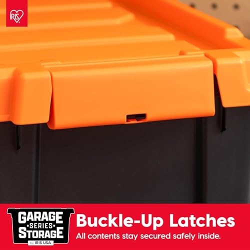 IRIS USA 12 Gallon Lockable Storage Bins with Lids, 2 Pack – Made in USA, Heavy Duty, Stackable Containers, Garage Organizing Bins Moving Tubs, Rugged Sturdy Equipment Utility Box – Black/Orange