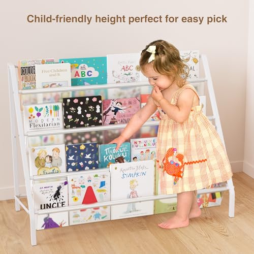 High-Transparent 4 Tier Kids Bookshelf, Sturdy Metal Large Size Book Rack Storage for Kids – Toddler Book Shelf Display for Nurasery, Kids Room, Deep Size Bookshelf Hold More Books