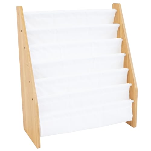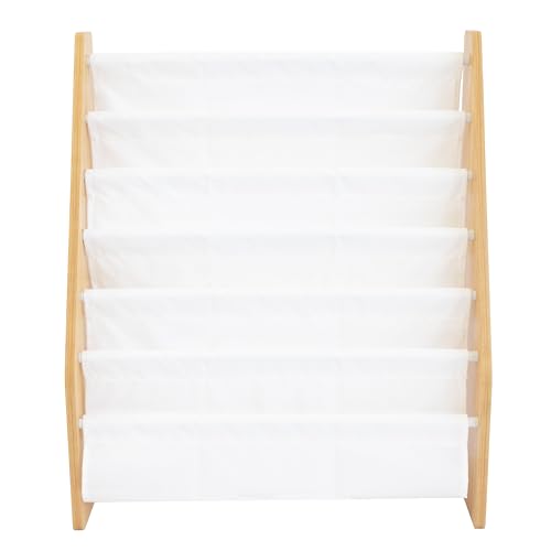 Humble Crew Kids Bookshelf 6-Tier Book Rack Organizer, Extra Large Toddler Bookcase with Fabric Storage Pockets, Front-Facing Display for Children’s Books, White/Natural Wood, Nursery/Playroom Storage