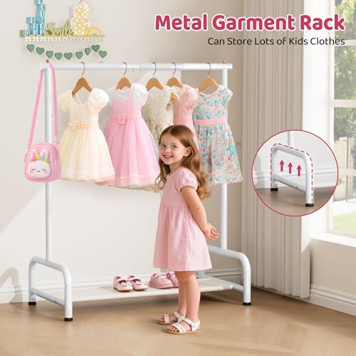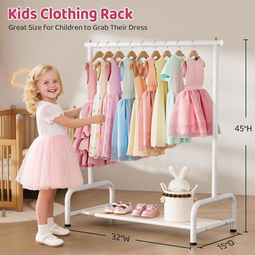 SLEEPING LAMB Kids Clothing Rack, Small Baby Clothes Rack with Bottom Storage Shelf, Kids Dress Up Rack Storage for Coats, Dance Costume Garment Rack for Hanging Clothes, White