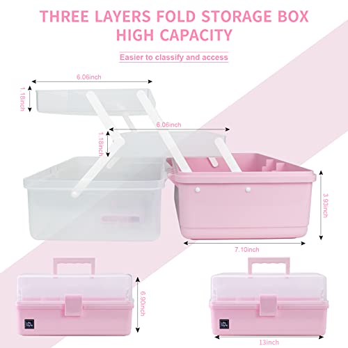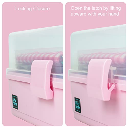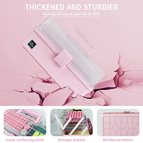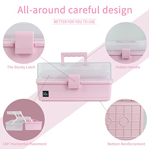 Creahaus 13 inch Art Craft Organizer Storage Box with 3 Layer, Multipurpose Plastic Tool Box with Handle for Sewing, Art Supply, Medicine, Nail, Hair Accessories (Pink)