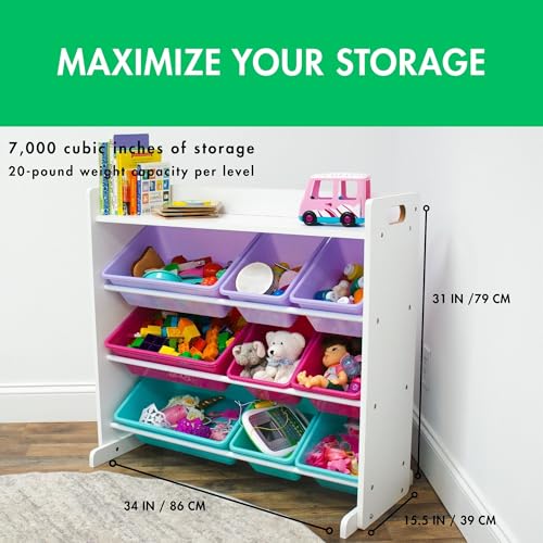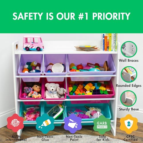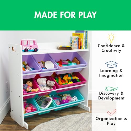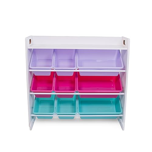 Humble Crew Crafts and Toy Storage Organizer with Top Shelf and 9 Removable Bins, White/Pink/Purple/Aqua Toddler Bookshelf with Organizer – Modern Rack Ideal for Kids’ Rooms, Playrooms, and Nurseries