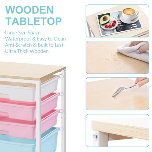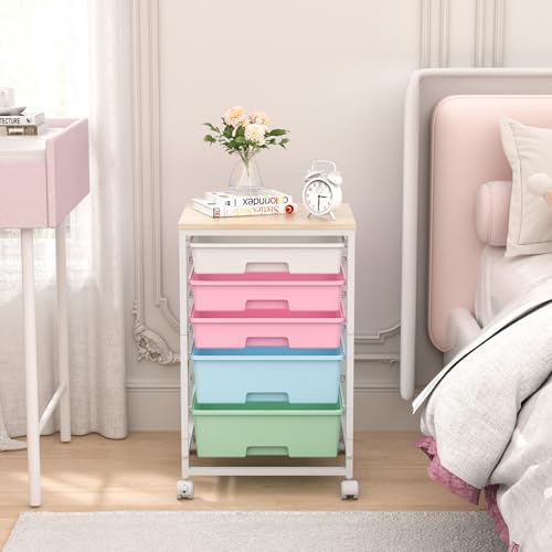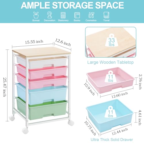 Utility Cart with 5 Drawers,Storage Drawer Cart with Wooden Tabletop and Lockable Wheels,Craft Storage Trolley Cart,5-Tier Rolling Utility Cart on Wheels,Rainbow