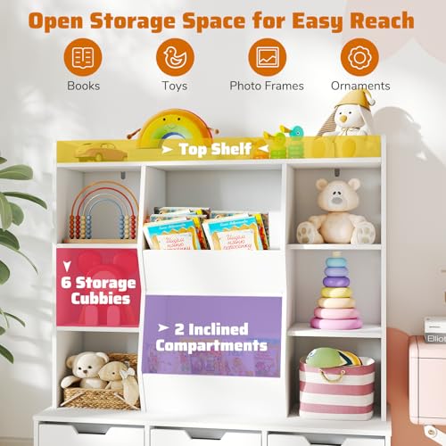 Abundant Storage Space: This HONEY JOY kids toy storage organizer features 1 top shelf, 2 inclined compartments, and 6 storage cubbies, providing plenty of space for toys, books, snacks, building blocks, and other items. Moreover, 47” optimal height and open design keep all items within reach. The children bookcase is great for developing kids’ habits of reading and sorting out.