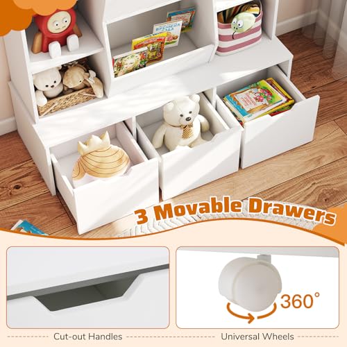 HONEY JOY Kids Toy Storage Organizer, 47” Wooden Bookcase w/ 3 Movable Drawers on Wheels, 8 Cubbies, Floor Storage Cabinet Toy Chest, Kids Display Bookshelf for Classroom, Playroom & Nursery, White