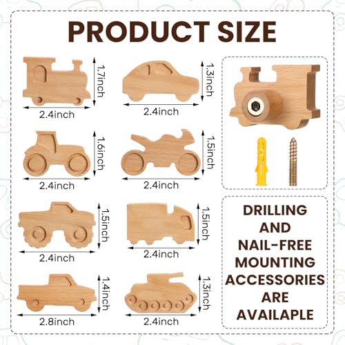 Durable Construction: each size of the brown wall mounted clothes hook is about 70mm/2.76inches long and 35mm/1.38inches wide, which is suitable and smooth; The eight different shapes of car designs add a fun and whimsical feeling to any room, combining practicality and beauty