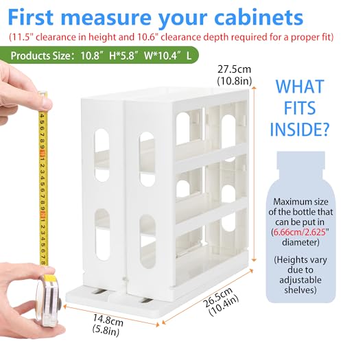 【⚠️MEASURE BEFORE YOU BUY! 】Total Size: 10.8″H x 5.8″W x 10.4″L; ⚠️Can put in max size of bottle: 2.625 diameter, heights vary due to adjust; If you plan put the shelf rack into cabinet, ⚠️your cabinet must have a minimum of 10.6” deep X 11.5” tall for a proper fit. If you have more height cabinets, you can adjust the shelves to the top location and items stored can sit safely peeking out over the top.There are 5 suction cup pad and 5 anti-slip gasket (⚠️please remenber to peel off the film on the gasket surface when use), you can use either of it.