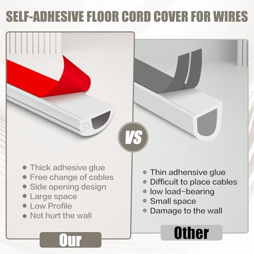 NO MORE TRIPPING HAZARD: The JAHOMFAI Wire Hider features a smooth bottom and curved top design that fits the wall perfectly. Its low-profile structure makes it easy to walk, vacuum, or roll over. While enhancing the look of your home decor, the cord hider effectively conceals messy cables, providing a safer environment for your family and pets