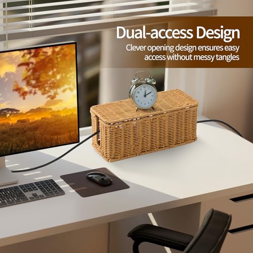 Dual-access Cable Organizer Box with Lid: Featuring Dual-access for easy cable insertion and retrieval. 180° flip-top design, keeps dust out while ensuring convenient use. Ventilated rattan panels enhance airflow to prevent overheating