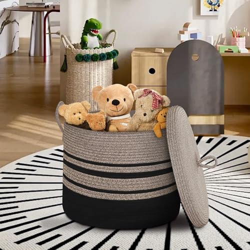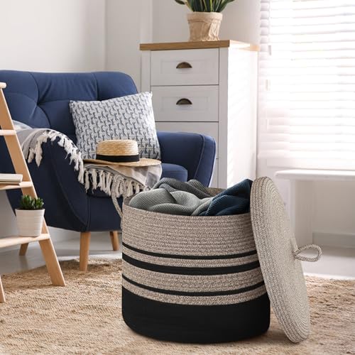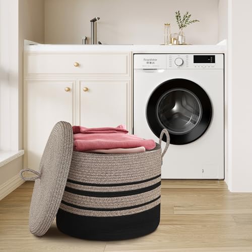 Extra Large Woven Basket with Lid, 18″ X 14″ Wicker Blanket Storage Basket Living Room, Tall Rope Storage Baskets for Toys, Decorative Kids Toy Bin Box with Cover, Baby Laundry Basket Hamper