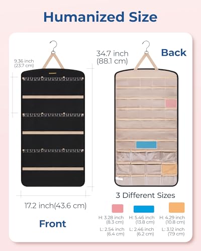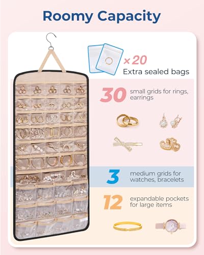 Roomy Capacity- Dual sided hanging jewelry organizer can storage and display a bulk of jewelry. Complete with 42 transparent pockets and 20 PVC anti-tarnish plastic bags , this jewelry storage can hold your rings, earrings, bracelets, watches, hairpins or other accessory. No more scatter them around. And the other side can accommodate 39 necklaces.