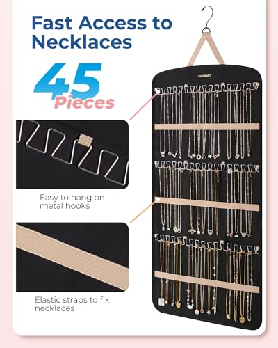 Thoughtfully Designed Hooks- Necklace organizer comes with 3 rows of sturdy metal hooks offer much easier and faster to access everything. Differ from messy jewelry boxes, superior elastic straps design can keep necklaces separated and untangled.The unique design truly earned the heart of jewelry lover