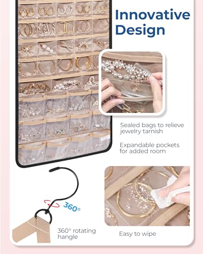 Perfect Organized Partner- Made of premium polyester, PVC material and strong metal hooks, this jewelry holder organizer features exquisite look with long durability. Two-sided design with 360 degree rotating hanger, making it can be rotated in any direction you need, and easily be hung on closet, door, or wall, taking up less space than a piece of clothing in your closet