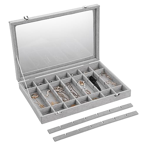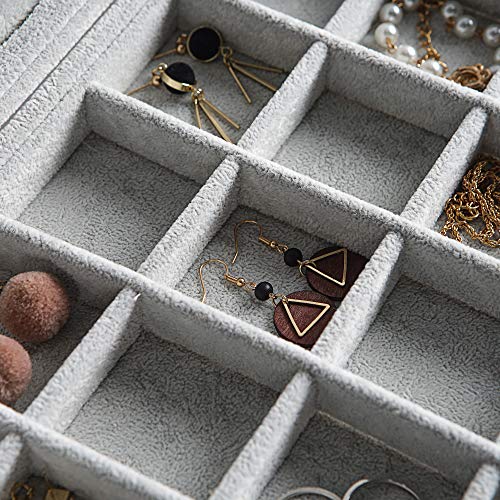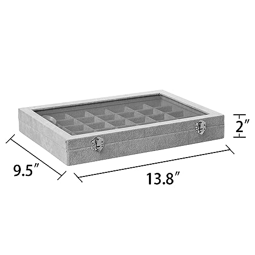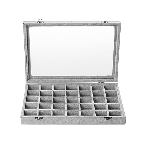 Frebeauty Velvet Jewelry Tray,35 Grid Jewelry Organizer with Clear Lid,Earring Holder Organizer Case with Clasp,Drawer Insert for Rings Studs,13.8 x 9.5 x 2 Inches,Gift for Women Girls(Grey)