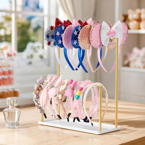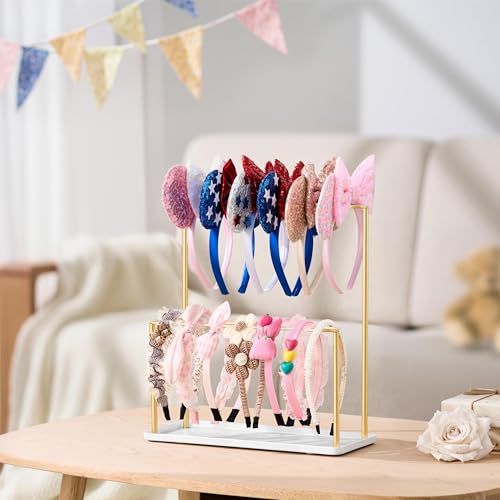 pickpiff Headband Holder Organizer Metal 2-Tier with Tray: Hair Accessories Display Stand Storage, Purse Charms Key Rings Rack Necklace Stand Home Bedroom for Girls Women, Gold