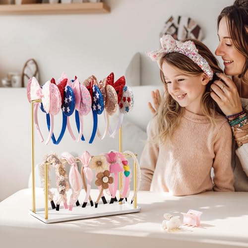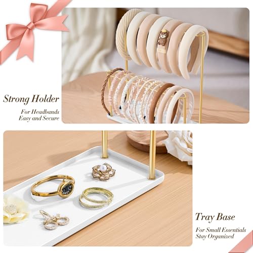 Headband Holder Organizer Metal 2-Tier with Tray: Hair Accessories Display Stand Storage, Purse Charms Key Rings Rack Necklace Stand Home Bedroom for Girls Women, Gold