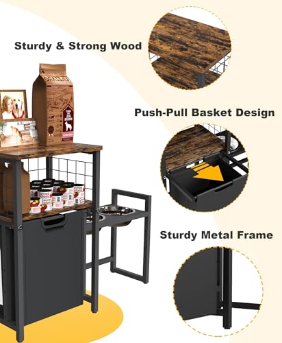 Durable and high quality: This dog food storage container with bowls is made of sturdy metal frame, durable and strong wood combination. The sliding basket is removable for easy cleaning, and the thickened Oxford cloth is waterproof and not easy to scratch. The recessed dog bowl design also prevents the bowl from being knocked over.Durable stainless steel dog bowl ( Φ6.4″) .