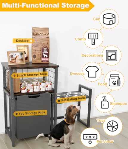 4-IN-1 fuction: This dog organization and storage contains four areas: dog feeding station, dog food storage cabinet, dog toy storage, desktop. You can organize dog toys, dog clothes, dog leash, dog snacks, dog nail clipper, can, dog food, dog photos, dog combs, pee pads, decorations and other pet supplies.