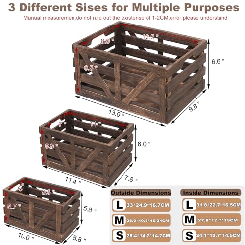 Wooden Storage Crates Nested Crates Set of 3 (Large,Medium,Small),Farmhouse Decorative Boxes with Handles for Home Organization,Display,Brown Wood Crates